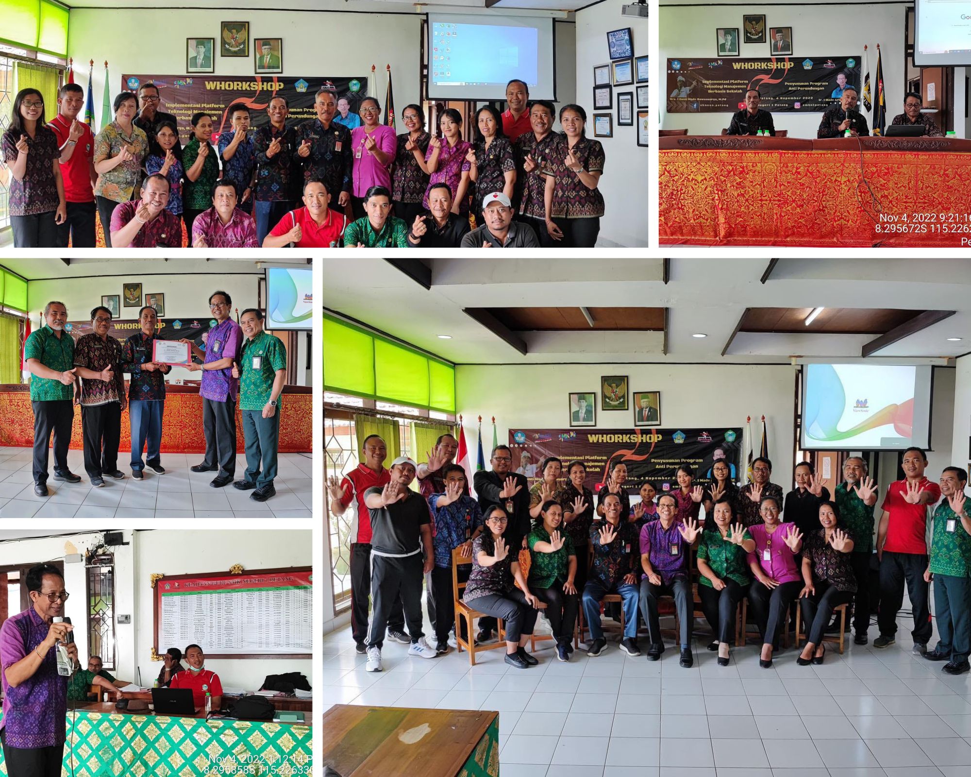 Pada hari Jumat, 4 November 2022 SMK Negeri 1 Petang melaksanakan workshop dengan dua narasumber yang berbeda yaitu Bapak Drs. I Gusti Made Bawasuarya, M.Pd. yang memaparkan materi tentang Implementasi Platform Teknologi Berbasis Sekolah dan Bapak Ir. I Made Ariasa, M.Pd. yang memaparkan materi tentang Penyusunan Program Anti Perundungan. Bapak Drs. I Gusti Made Bawasuarya, M.Pd. merupakan pengawas SMK Provinsi Bali sedangkan Bapak Ir. Made Ariasa, M.Pd. merupakan Komisioner KPPAD Provinsi Bali Bidang Pendidikan. Kegiatan workshop ini dilaksanakan di ruang guru SMK Negeri 1 Petang dan diikuti oleh Bapak/Ibu Pendidik. Workshop ini juga merupakan rentetan kegiatan Program Pengembangan SMK Pusat Keunggulan (SMK PK).
